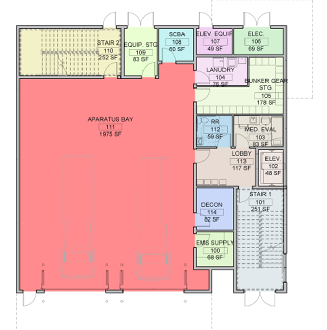Inside, the layout includes a modern apparatus bay, daily living quarters for firefighters and EMTs, designated training areas, and space for physical wellness—all organized to support around-the-clock service with minimal response delay. Every element of the design is intentional, reflecting operational priorities while fostering comfort and readiness for those who serve.